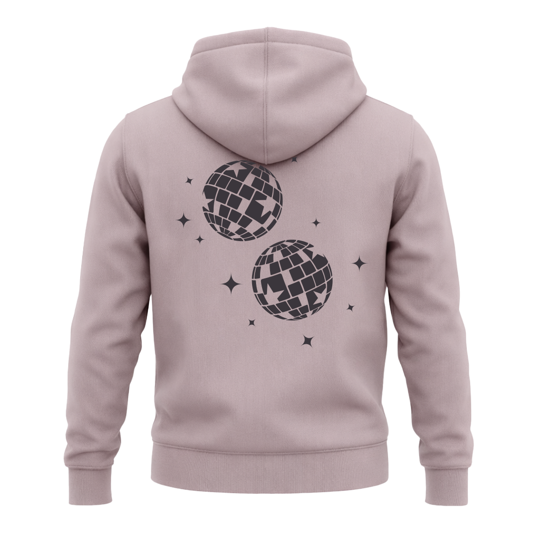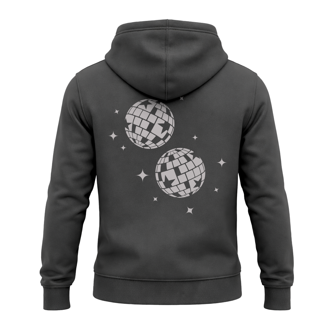 Dicker, hochwertiger Baumwoll-Stoff trifft auf entspannten Tragekomfort. Der Frontprint „See you on the dance floor“ und der große Diskokugel-Backprint machen den Hoodie zum starken Statement für Let’s Dance – Cozy, stylisch, dance-ready.